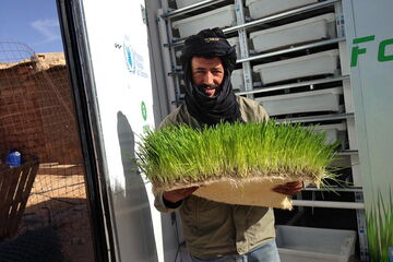 Mit Hilfe des WFP Innovation Accelerator-Pogramms hat er ein Hydrokultur-System entwickelt, mit dem die Sahrauis Gerstengras für ihre Ziegen anbauen können. In geschlossenen Containern wächst Grünfutter in einer Nährlösung, ohne dass Erde benötigt wird und mit nur minimalem Wasserverbrauch. Die notwendige Energie kommt von Solarzellen. Die High-Tech Lösung wurde an die verfügbaren Materialien und Ressourcen der Sahrauis angepasst.