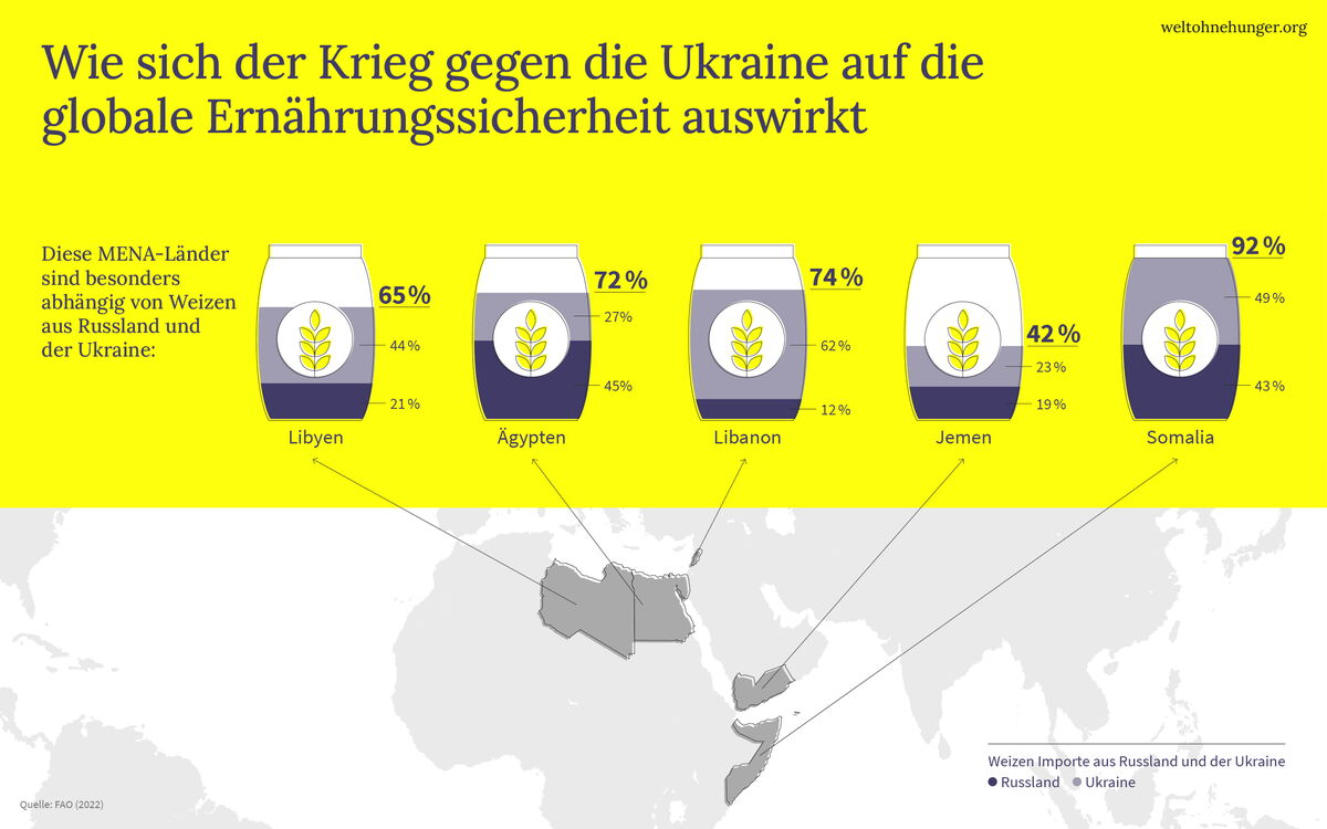 Große Mengen an Weizen aus der Ukraine und Russland werden von bevölkerungsreichen Ländern wie Ägypten, Türkei, Bangladesch oder Indonesien gekauft. Besonders problematisch ist jedoch die Abhängigkeit vieler Entwicklungsländer von den Getreidelieferungen aus Russland oder der Ukraine: Sie haben teilweise hohe Anteile ihrer Weizenimporte aus diesen Ländern bestritten und wenige andere Handelspartner, auf die sie schnell ausweichen können.