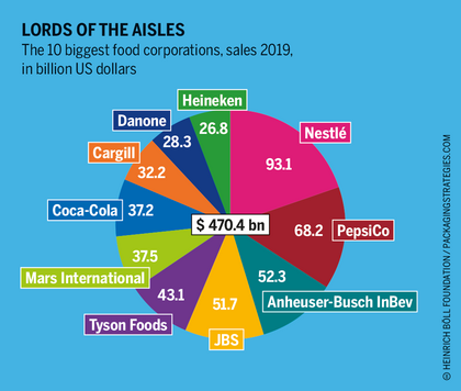 A market concentration with especially negative consequences for health can be seen in food processing. In 2019, five of the biggest food processing companies in the world, Nestlé, PepsiCo, Anheuser-Busch InBev and the meat producers JBS und Tyson Foods, each had sales of more than 40 billion US dollars. These five companies controlled 23 percent of the market share of the top 100 food processing companies worldwide. Their combined sales of 308 billion dollars a year was higher than the gross domestic product of Finland. These food giants use their political clout to maintain their market shares. This was made clear in 2016, in what came to be known as the “Coke Leaks” – a series of emails between two former senior managers at Coca-Cola. These suggest that research results that would suit industry interests should be generated by commissioned studies on the causes of obesity.